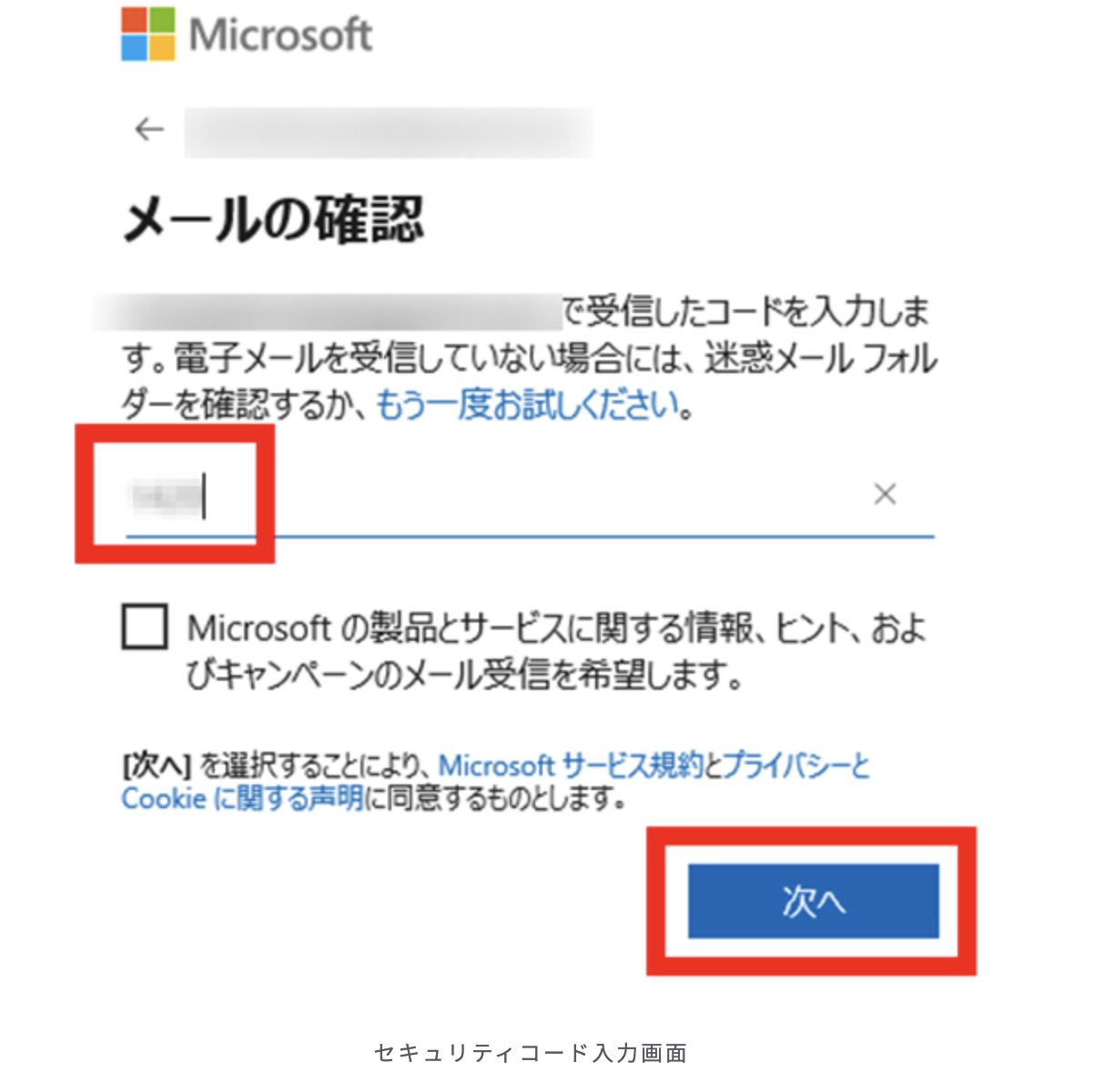 Microsoftの製品とサービスに関する情報、ヒント、およびキャンペーンのメール受信を希望する方は、セキュリティコード入力欄の下にあるチェックボックスにチェックを入れて「次へ」を選択する。