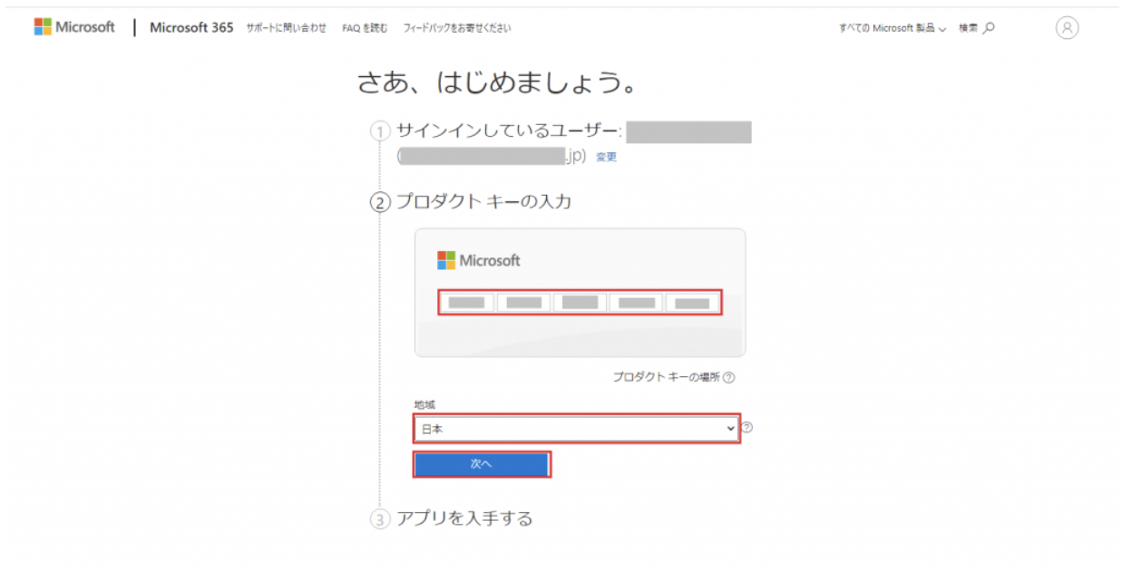 25英数字で構成したOffice 2021 の初インストール用の【プロダクトキー】を入力し、【日本】を選択し、【次へ】ボタンを押しましょう。