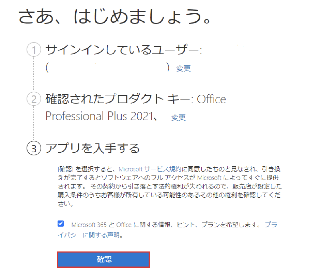 セットアップしたOffice製品を確認し、「Office Professional Plus 2021」と表示されていると、【確認】ボタンを押します。