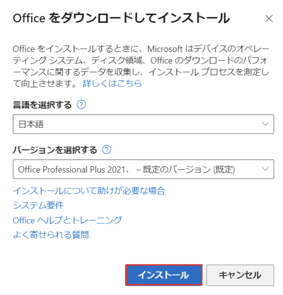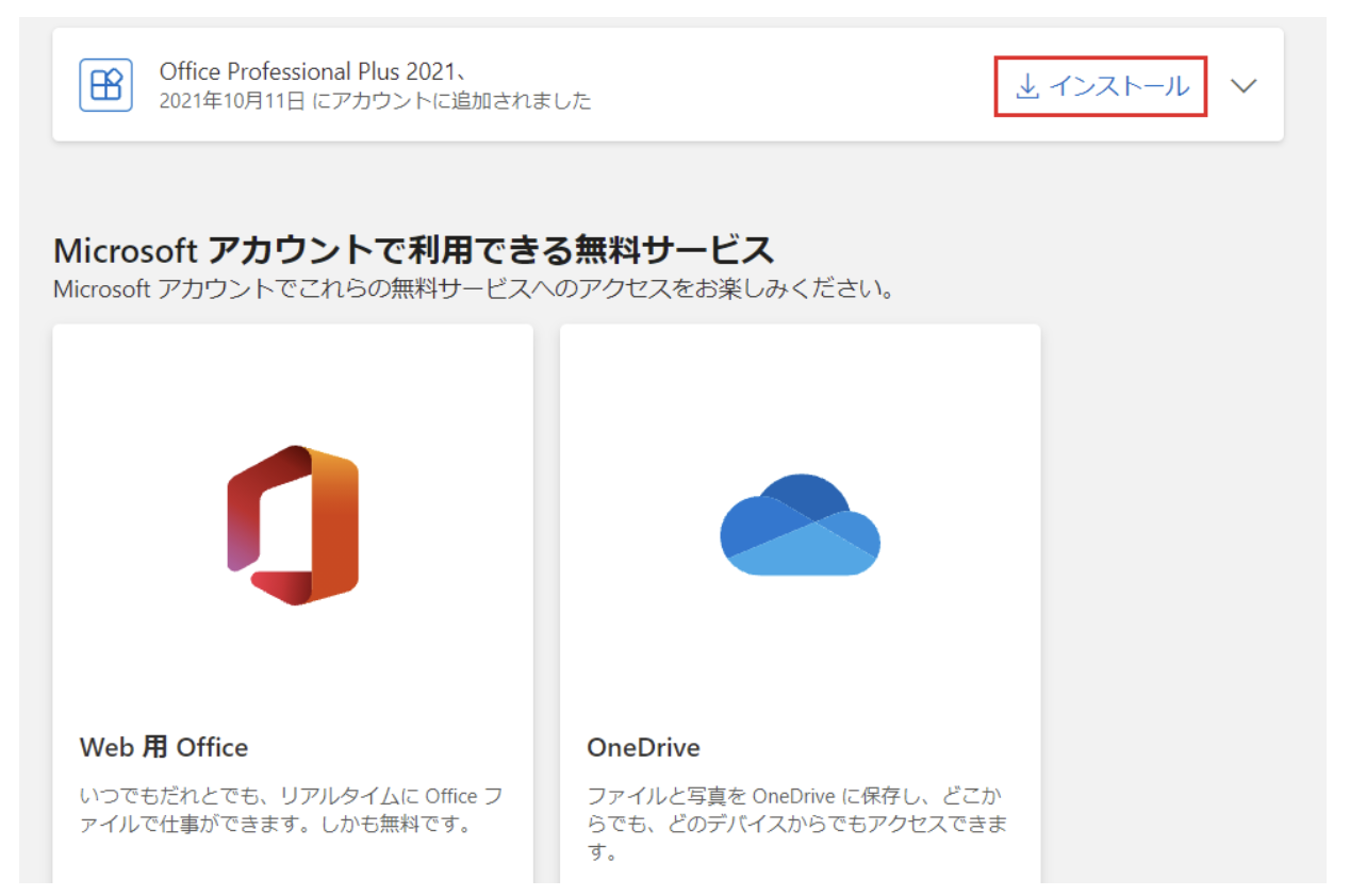 Microsoft アカウントページに移動し、「Office Professional Plus 2021」の右にある「インストール」ボタンを押します。