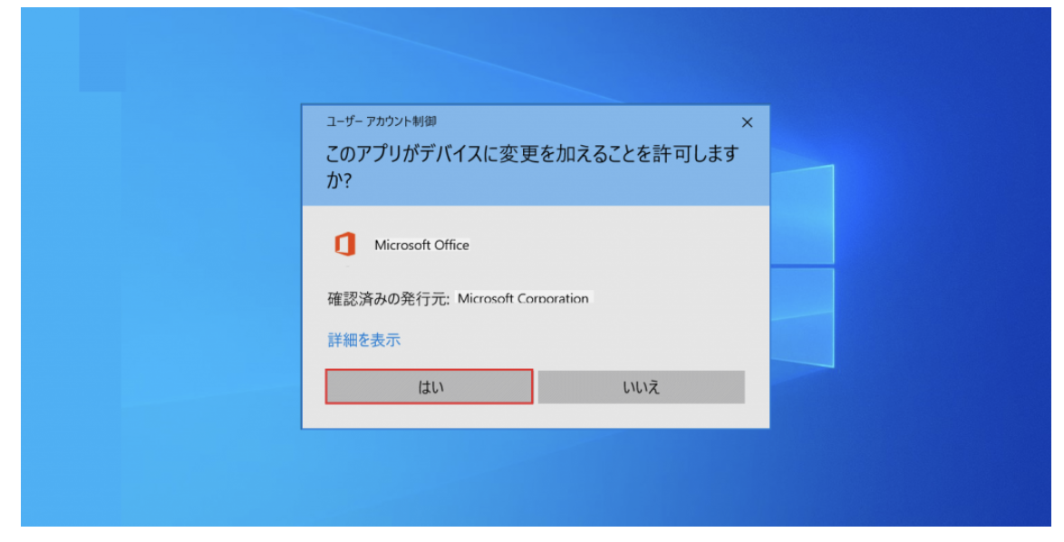つぎに、「ユーザーアカウント制御」の画面になります。「このアプリがデバイスに変更を加えることを許可しますか?」と聞いてくるので、「はい」をクリックしましょう。