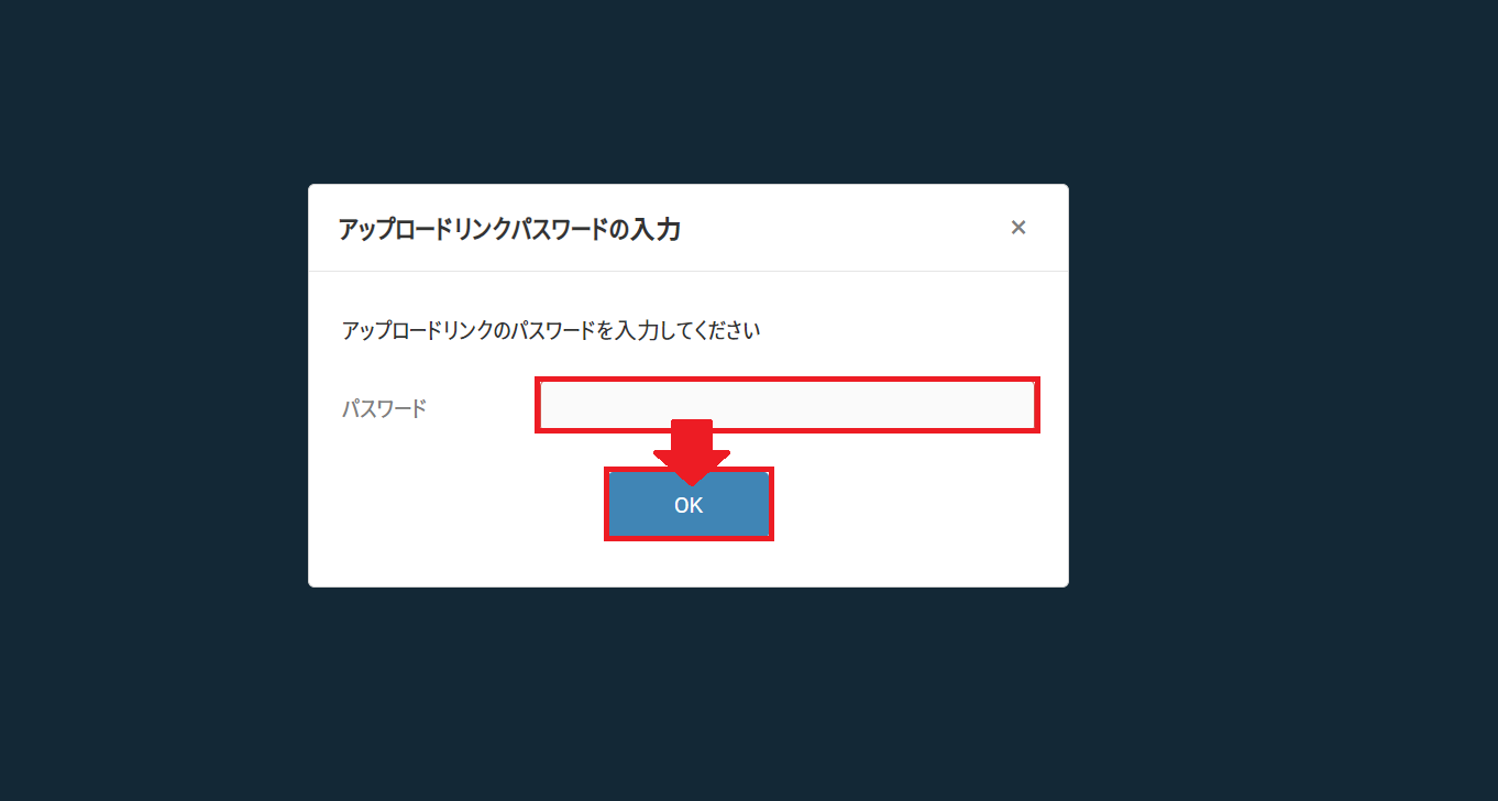 アップロードリンクのパスワードを求められるので、パスワードを入力してOKを押下。