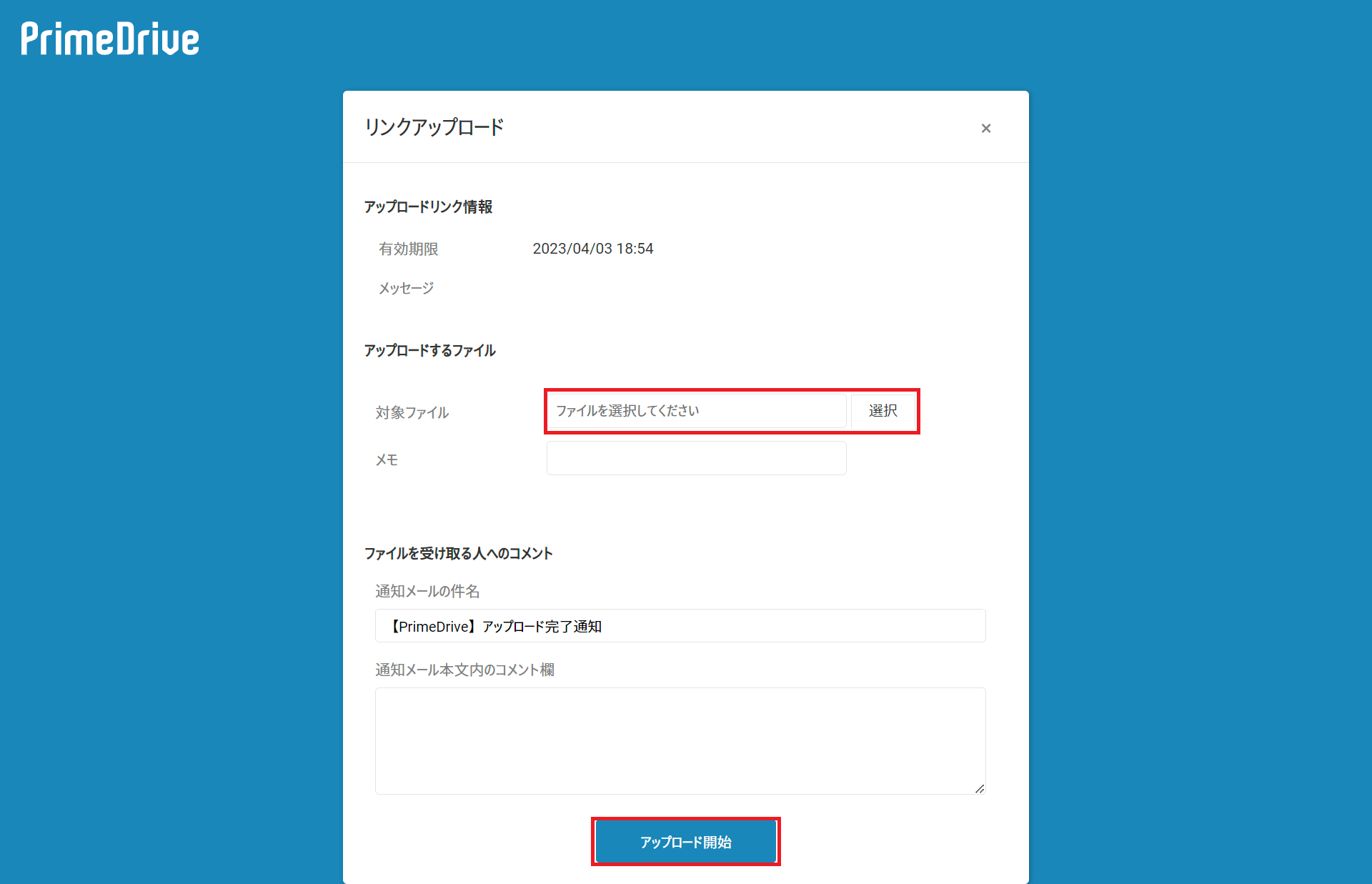 共有したいファイルを選択ボタンを押下して選び、アップロード開始を押下。