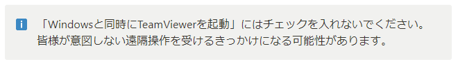 同様に、「Windowsと同時にTeamViewerを起動」にはチェックを入れないでください。皆様が意図しない遠隔操作を受けるきっかけになる可能性があります。