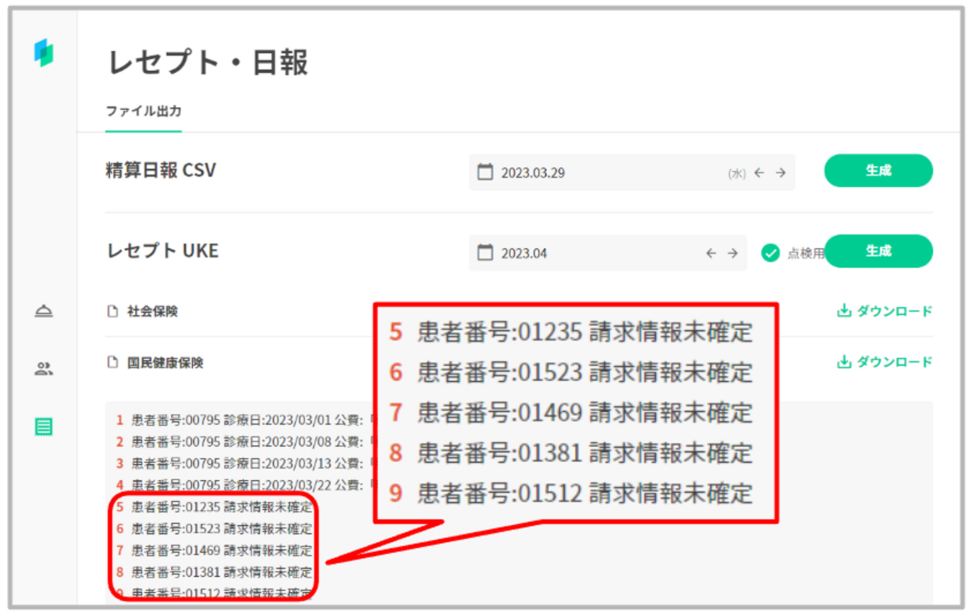 メッセージの内容は「患者番号:○○○○ 請求情報未確定」となります。