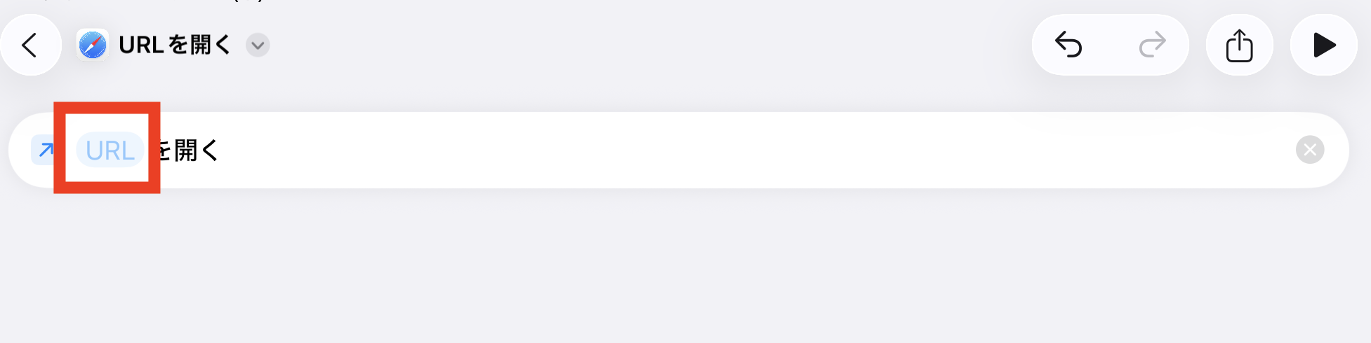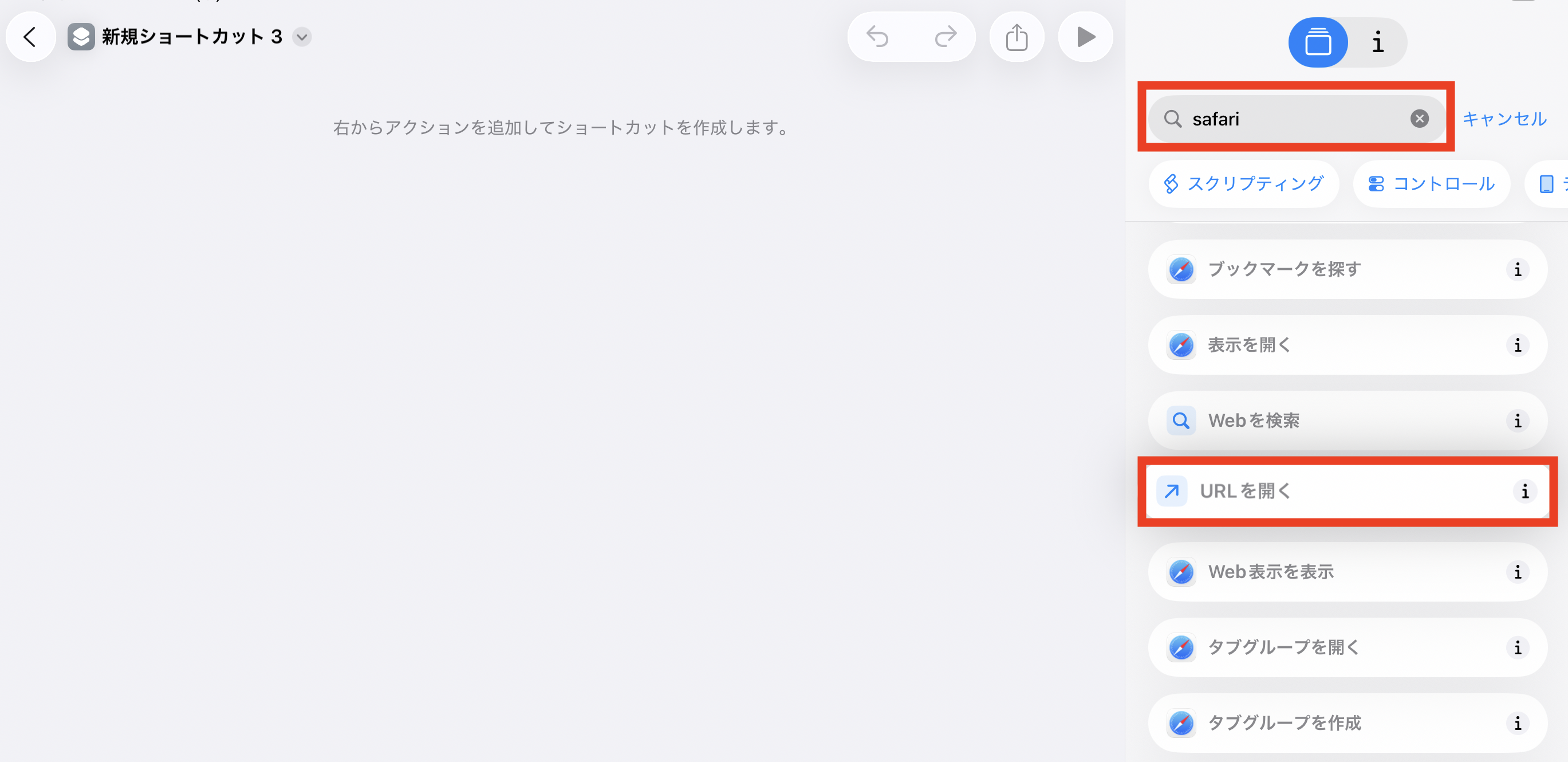 検索バーに「safari」と入力し、「URLを開く」をタップします