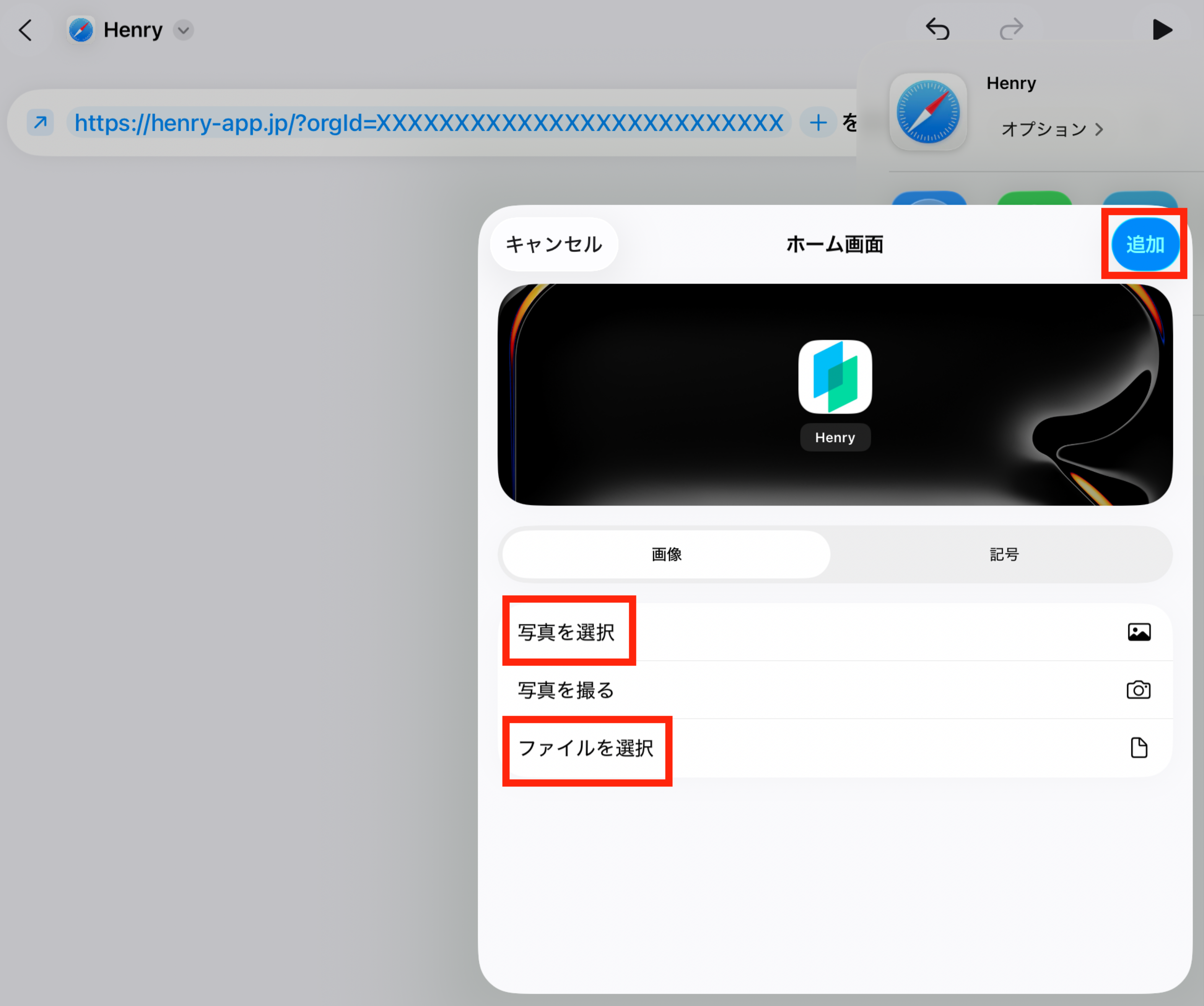 「ファイルを選択」もしくは「写真を選択」でHenryのロゴを選択し、「追加」をタップします